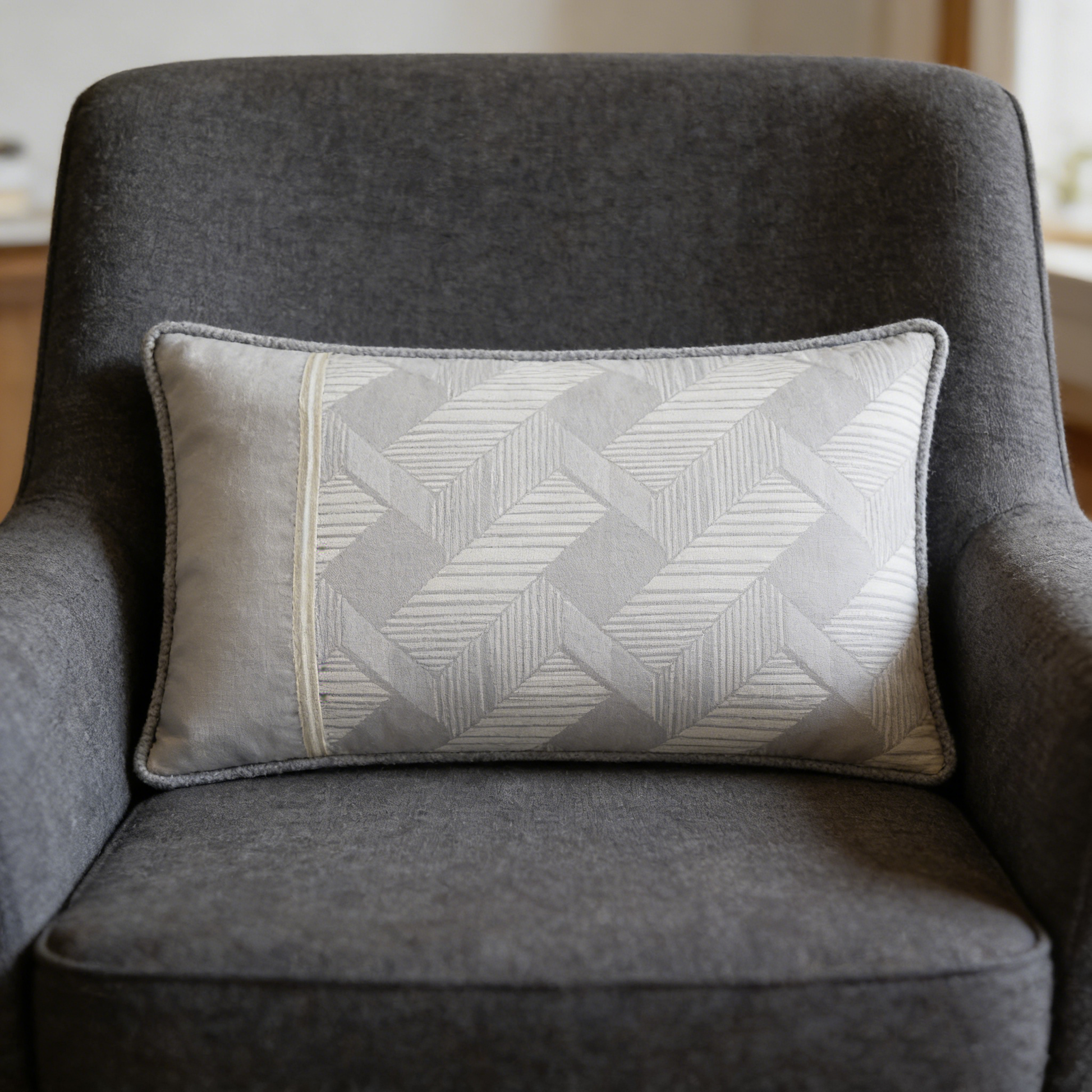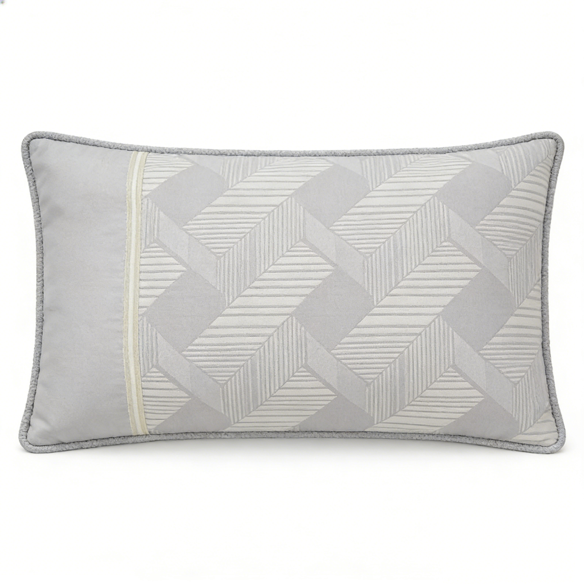 A plush rectangular pillow with a repeating chevron motif in light gray and white, highlighted by a cream accent stripe and textured trim for a refined, modern look.